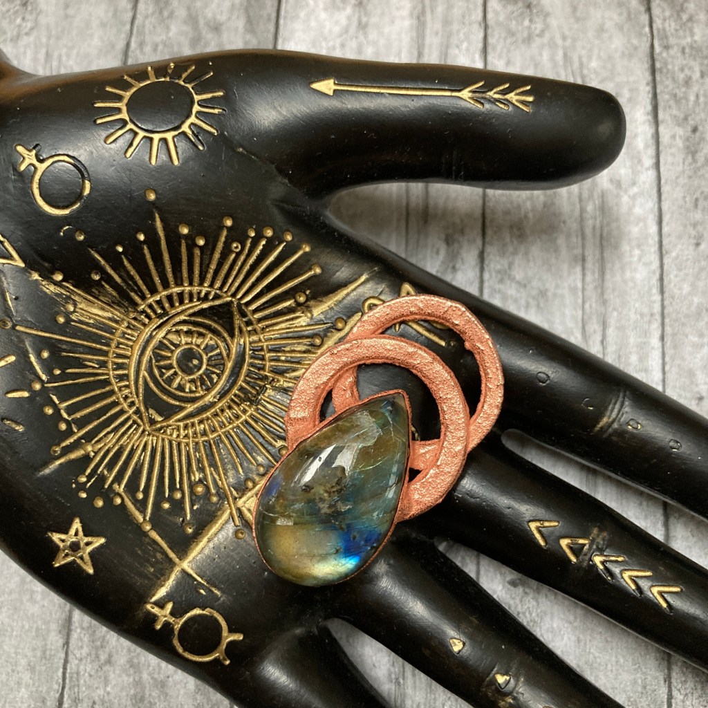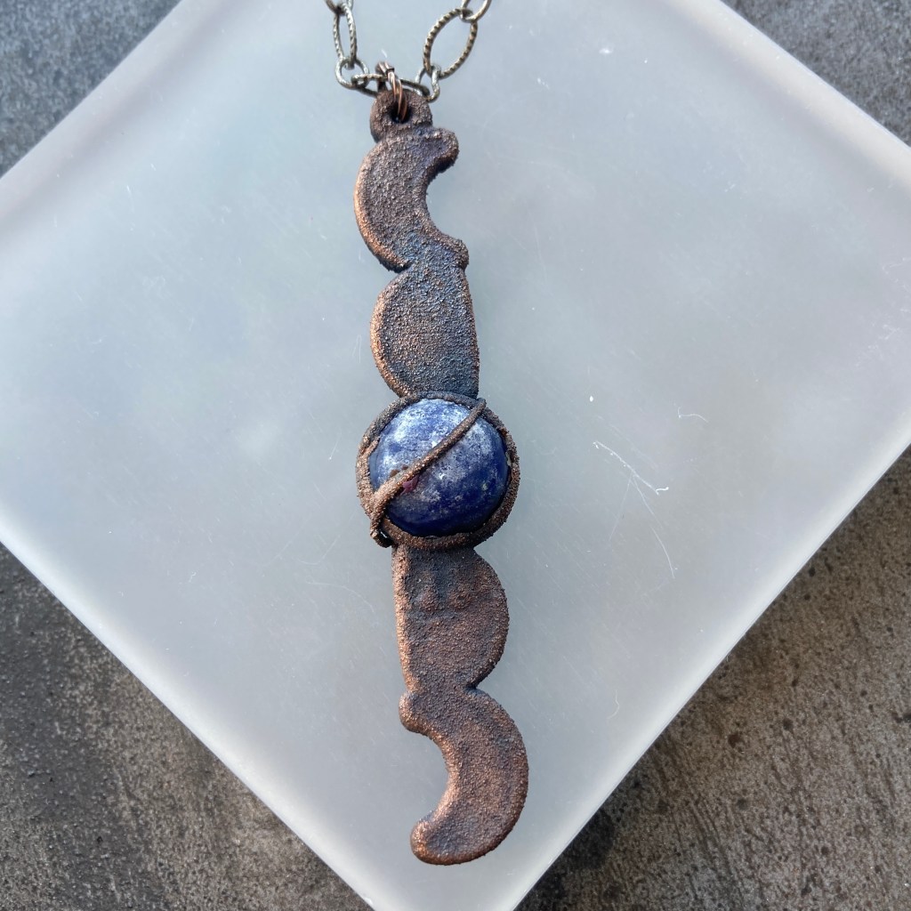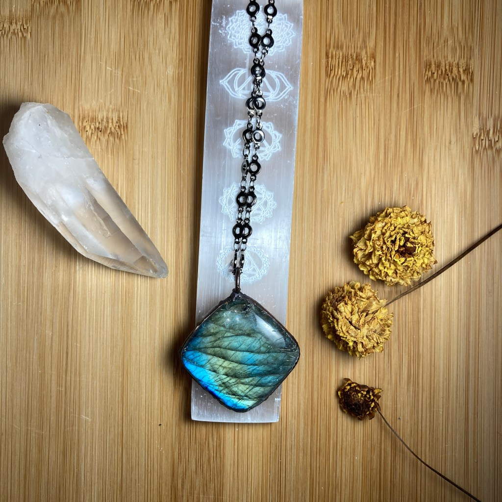This necklace is highlighted with a one and a half inch long flashy Labradorite crystal. Phases of the moon Labradorite crystal necklace Handmade, electroformed, with patina Matching gunmetal adjustable chain 2″ W x 1.5″ L Giftable- ships complete with metaphysical crystal card, gift bag, and personalized note upon request Free US shipping — Read on…