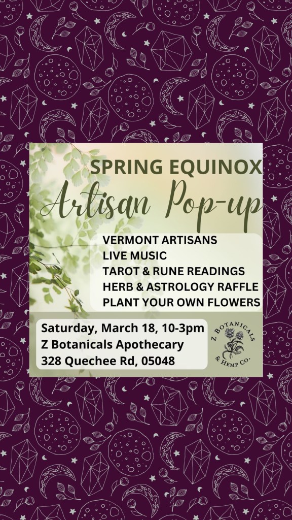 Local friends, please join us in celebration of the spring equinox! We will be hosting a variety of Vermont woman artisans vending: