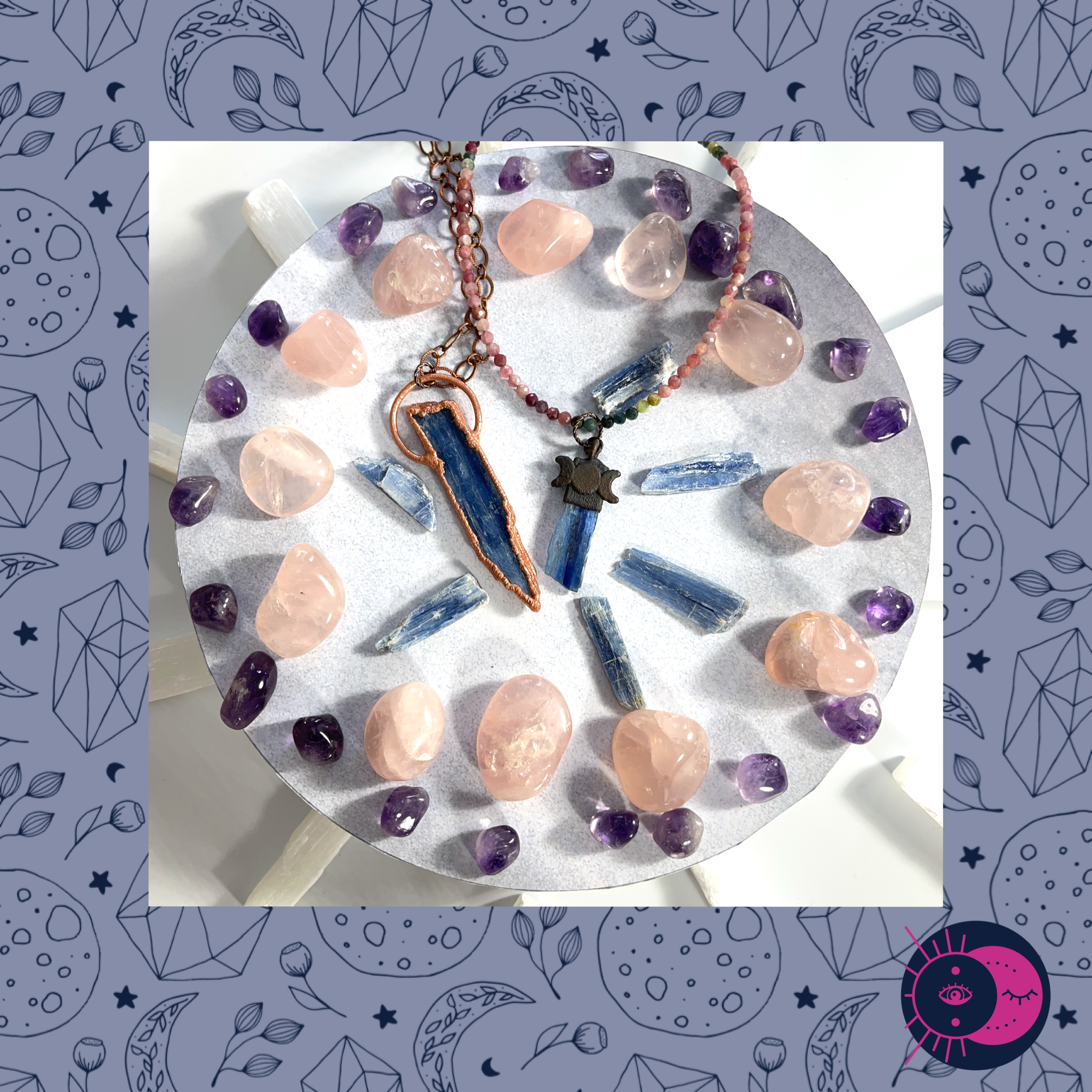 Join me in pairing crystals and crystal healing along with something else that resonates with you and holds the intention to live in sync with Mother Gaia and her cycles, to dance to her rhythm, turn with her seasons, to be in resonance with her heart beat. It’s a pulse, a flow, that brings joy and contentment. One way we can connect to Mother Gaia and Lady Luna is thru a crystal grid on the eve of the Full Moon. This will energize your crystals and strengthen your intentions you may have set on the New Moon not too long ago. Full Moon evenings are a meaningful time to create gem water or charge your crystal jewels on the windowsill. Creating crystal rituals at lunar phases helps me live more naturally, feeling less linear, and more like a cyclical being.